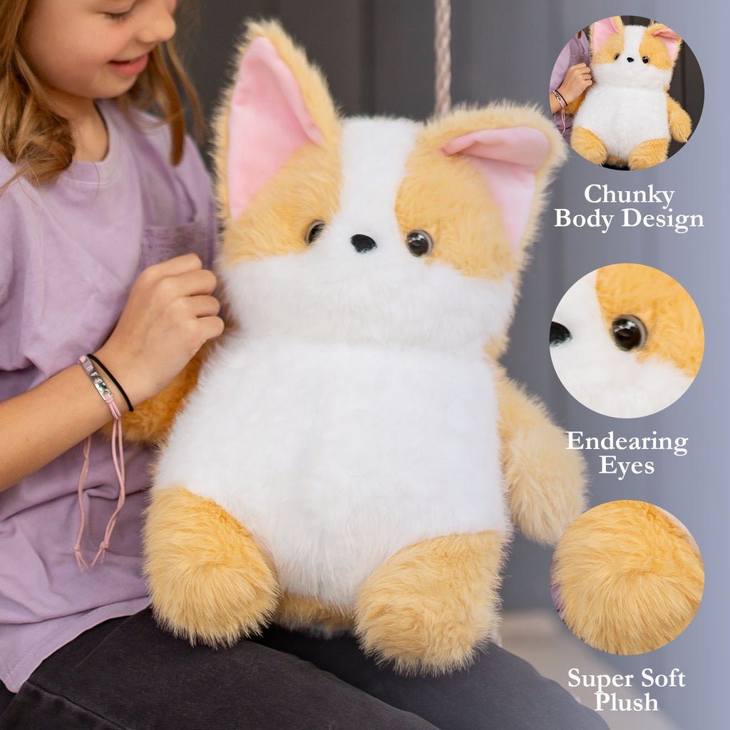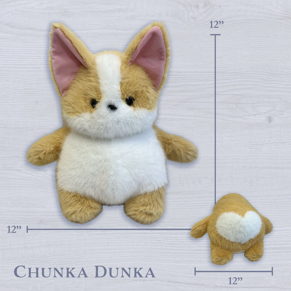 The Chunka Dunkas Corgi showcases accurate tan-and-white corgi coloring, those iconic oversized ears, ultra-soft plush construction, pudgy body that emphasizes corgis' naturally stout proportions, and the delightful heart-shaped bottom detail that corgi enthusiasts adore