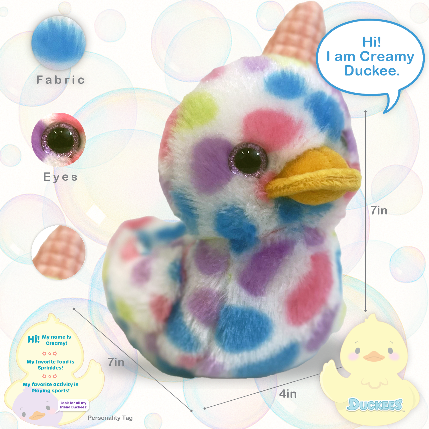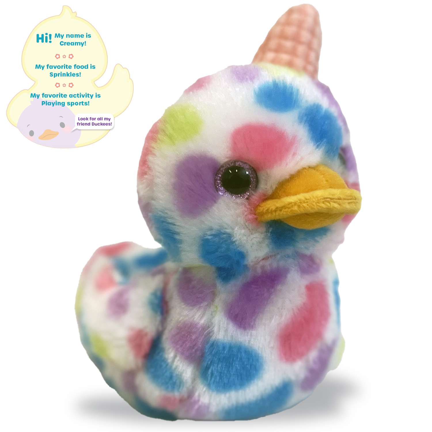 Meet Creamy, the sporty Duckee Ice Cream who loves sprinkles and playing games! This 7" plush pal is delightfully soft, squishy, and ready for endless fun. Designed in the USA and crafted with care, Creamy brings color, comfort, and sweetness to every hug.