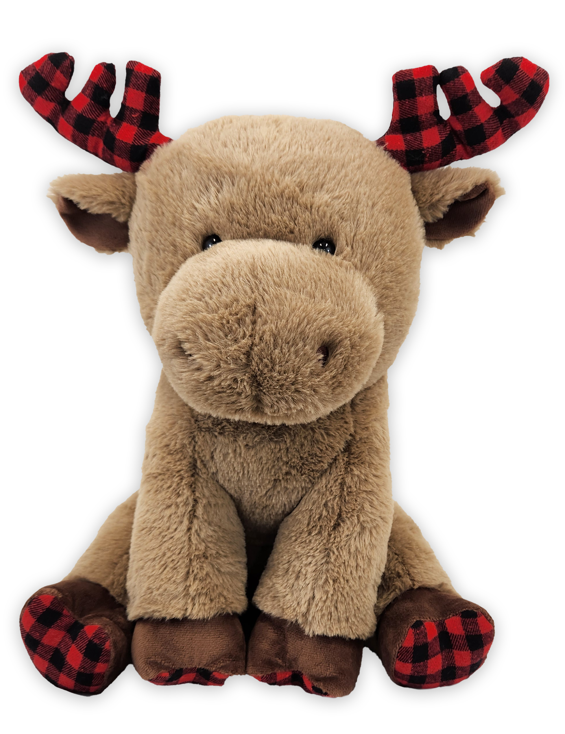 Extra Large Monty Moose - The heart of the forest ... meet Monty Moose. With his flannel buffalo printed feet and antlers, to his cozy cocoa plushy body, he is the ultimate fireside cozy companion for all ages.